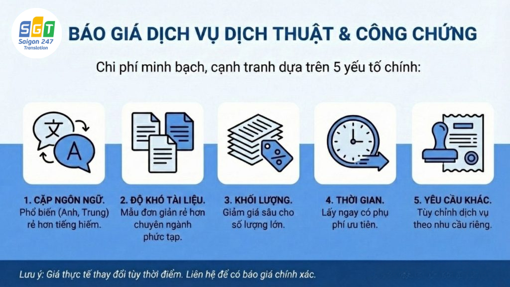 Thời gian: Dịch lấy gấp (trong ngày) sẽ tính thêm phụ phí theo mức ưu tiên, tùy thời điểm.